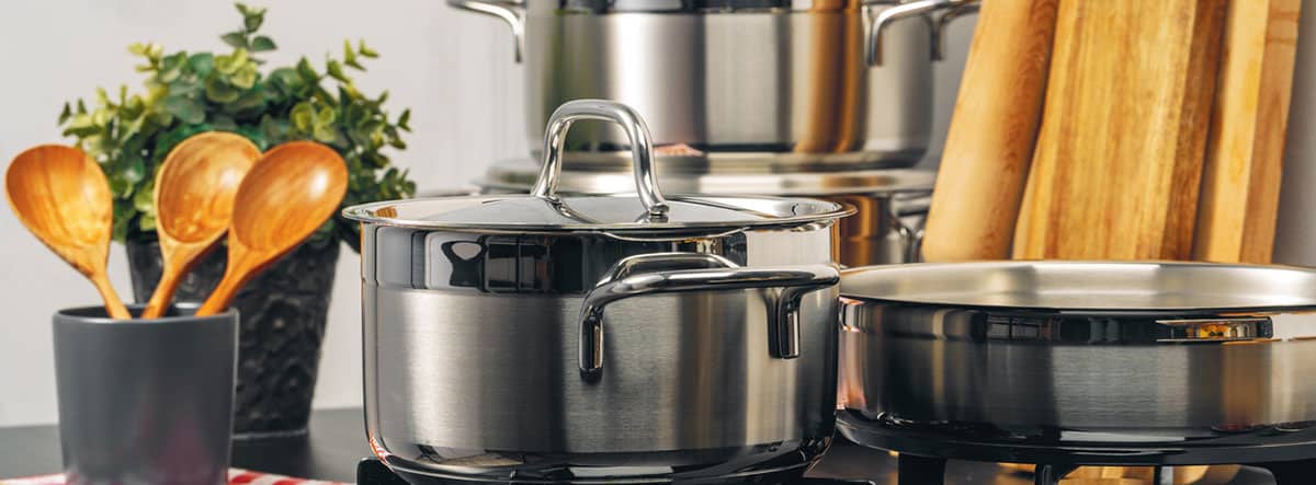Este material es una aleación de hierro con una mínima cantidad de carbono y pequeñas proporciones de otros metales (cromo, níquel…) que pueden liberarse hacia los alimentos en función del tiempo de contacto, del grado o calidad de la aleación y del contacto con sustancias ácidas como el tomate. Aunque el acero más usado en sartenes u ollas es el 18/10 (18 partes de níquel y 10 de cromo) y es seguro en estas proporciones, existe otro tipo de acero (el japonés) muy utilizado en cuchillos y de mayor calidad ya que no contiene ni cromo ni níquel. Otra de las ventajas de los utensilios de acero inoxidable es que son económicamente asequibles, resistentes, antiadherentes y fáciles de limpiar. Sin embargo, son peores conductores del calor que el titanio y se deben evitar en personas con alergias al níquel y con sensibilidad química.